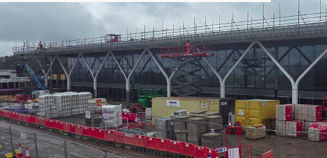 Construction is progressing well on the main interchange building, with the structure continuing to take shape, including the roof and external brickwork.